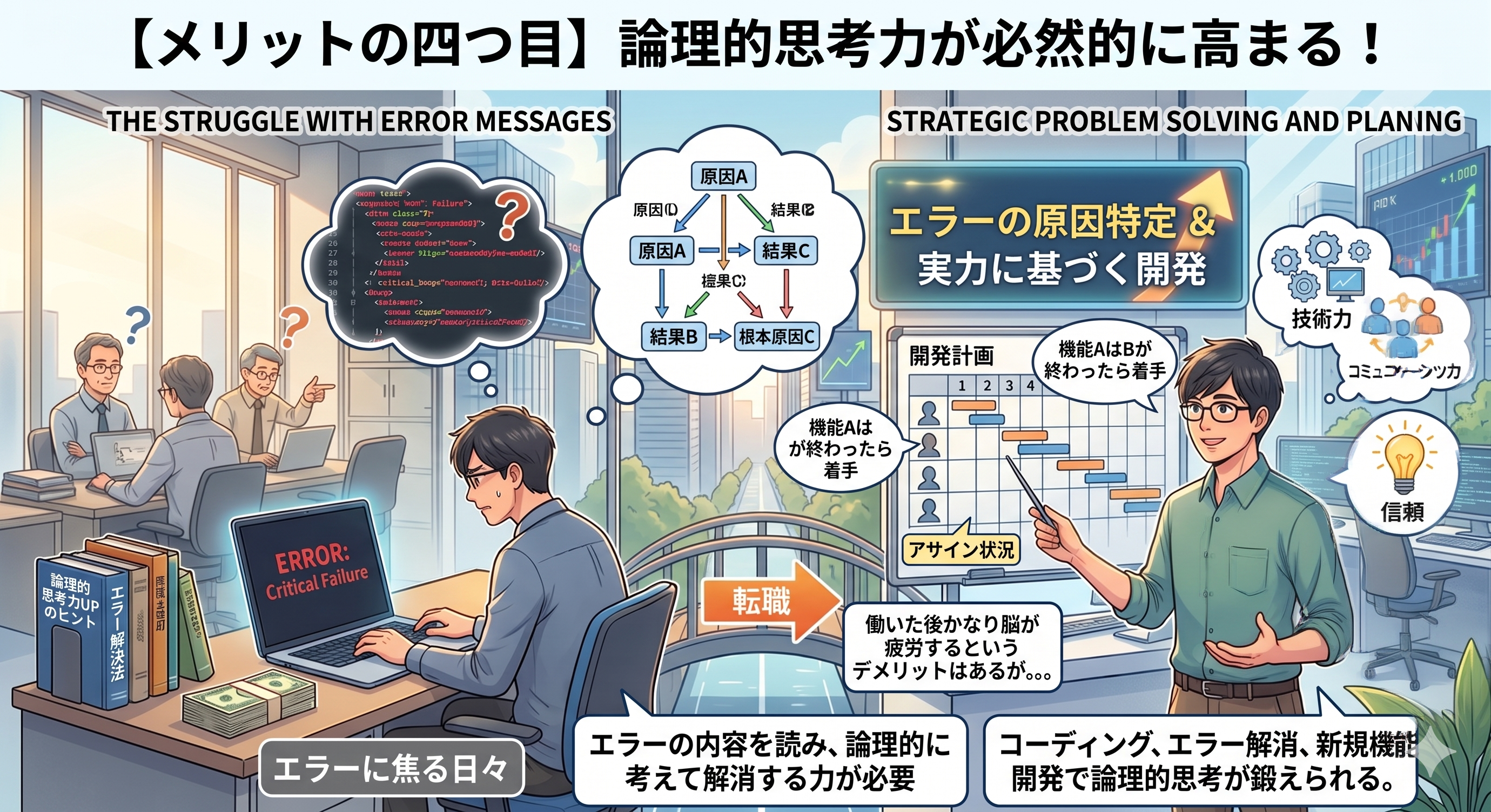 エンジニアとして働いていてエラーなんて日常茶飯事ですし、日々上記のようなことを考えているわけなので、必然的に論理的思考力が高まります。