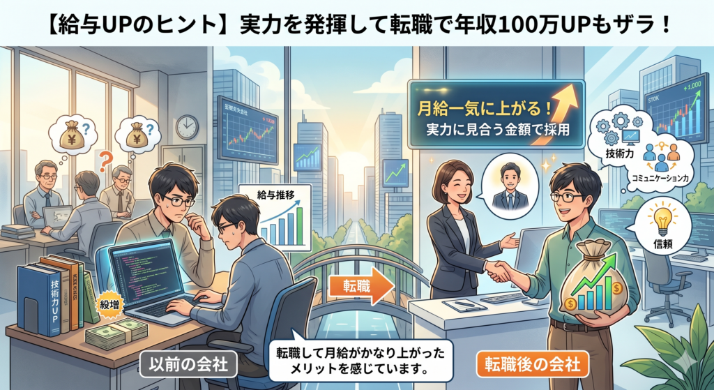 1つの会社にいて給与を上げやすいかと言われれば、そんなことはない気がしますが、転職時に年収が100万UPしたなんて話はザラです。