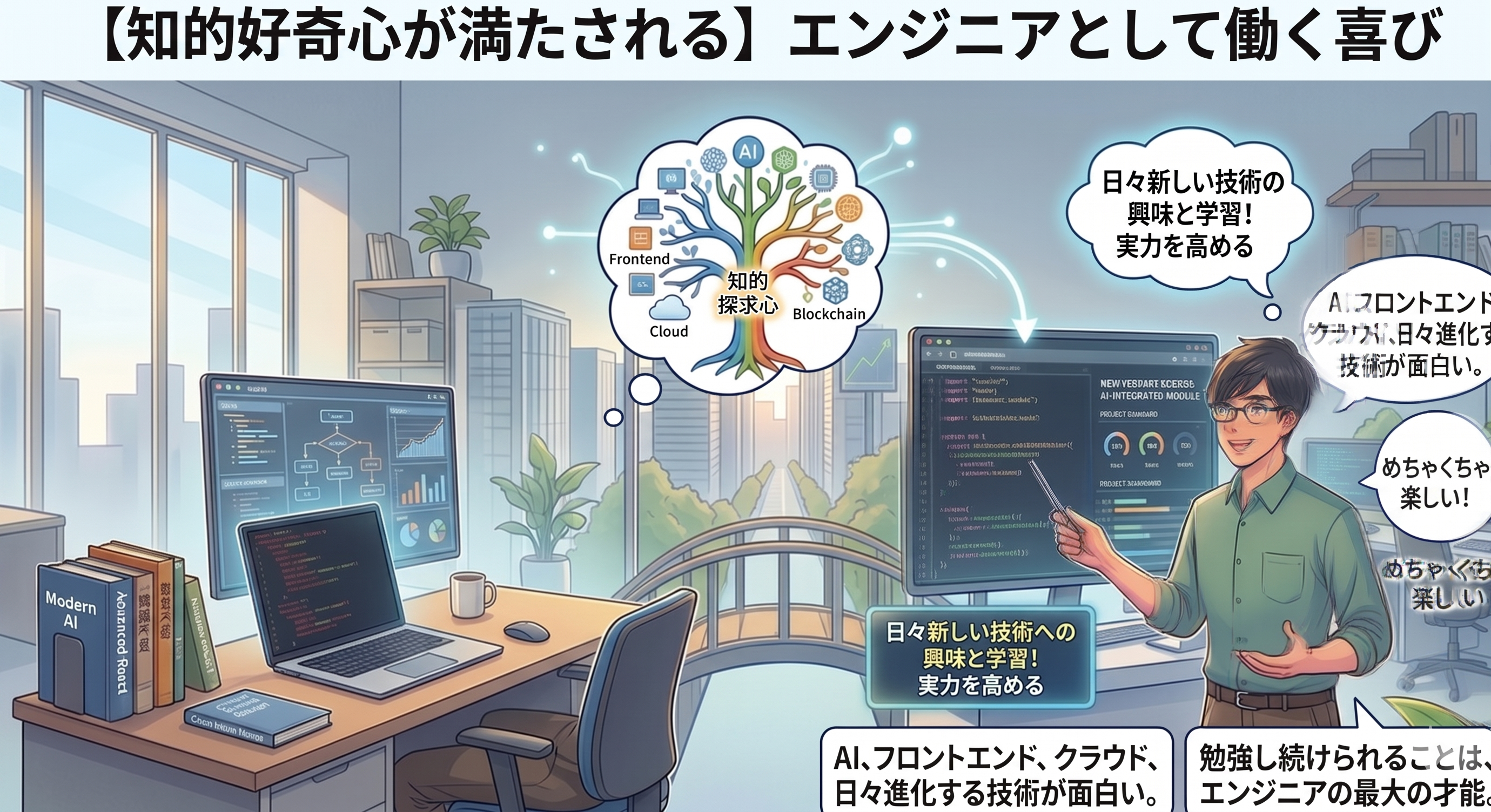 なので、エンジニアとして働く上で、日々勉強することが大事というかほぼ必須みたいなところはあるのですが、知的好奇心が旺盛な自分からするとめちゃくちゃ楽しいです。