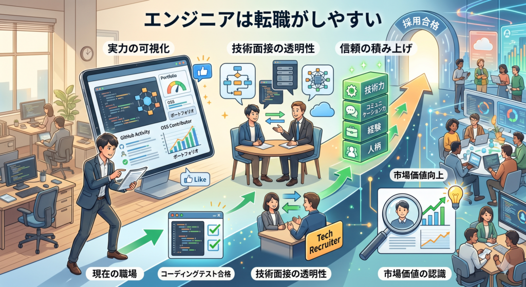 一緒に働く前に、その人の技術的な実力をある程度測ることができる。それがエンジニアの転職のしやすさの理由なんだろうなと思います。