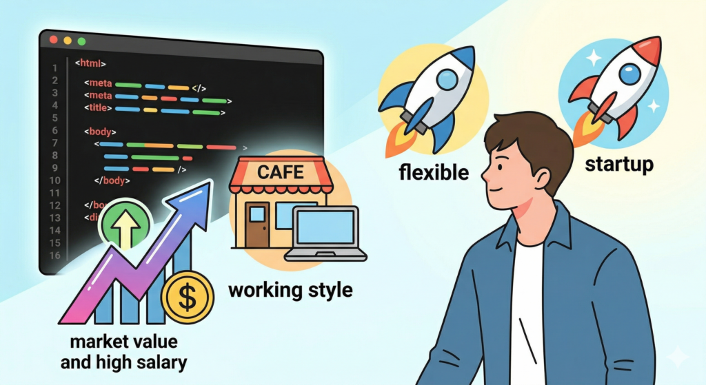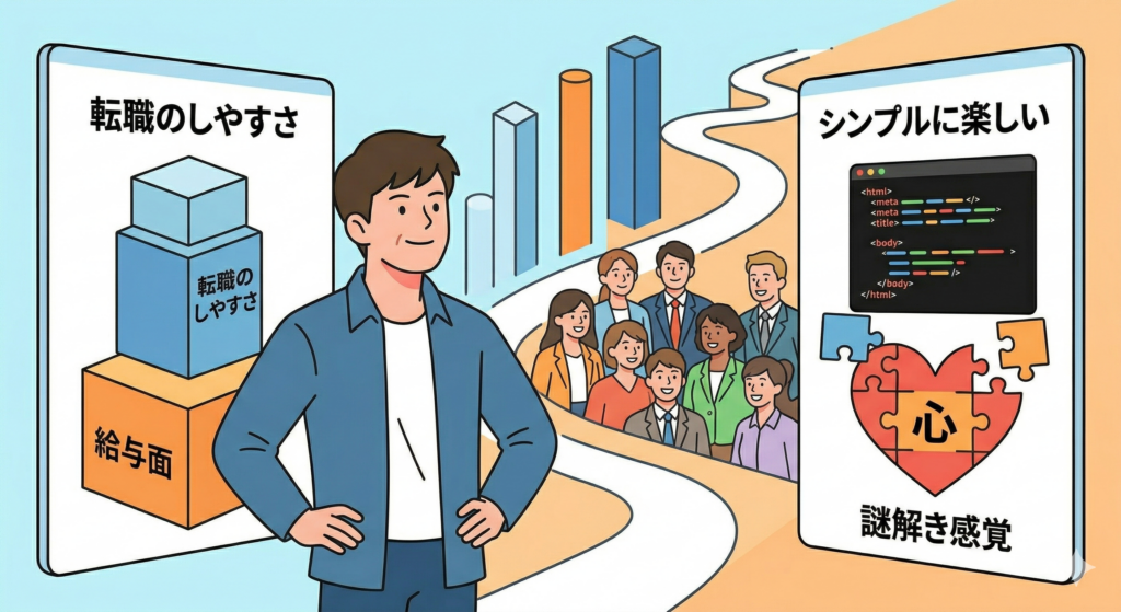 自分はこの先どうしていくべきかを真剣に考えるのですが、これからの時代的にIT系の会社でエンジニアになるのが、働きやすさや市場価値、給与面で最適な選択だと考え、エンジニアになることを決めます。